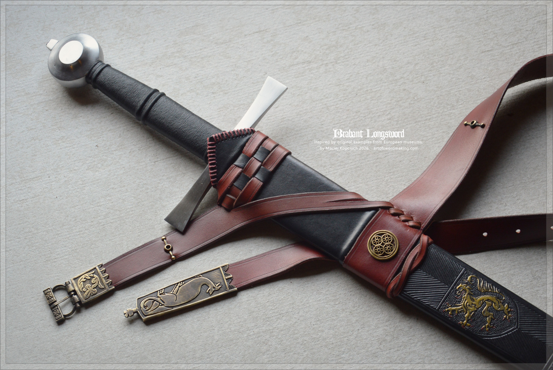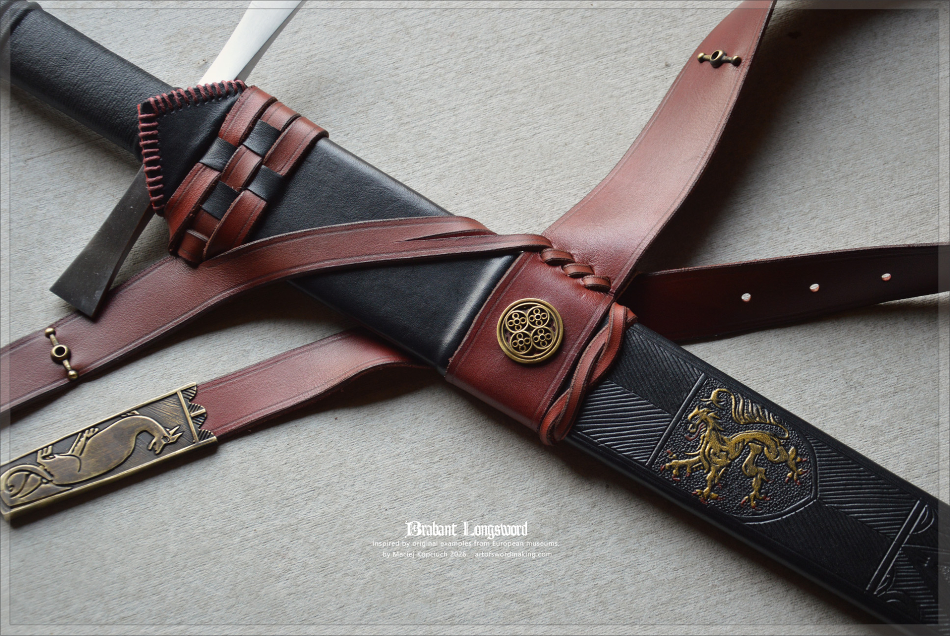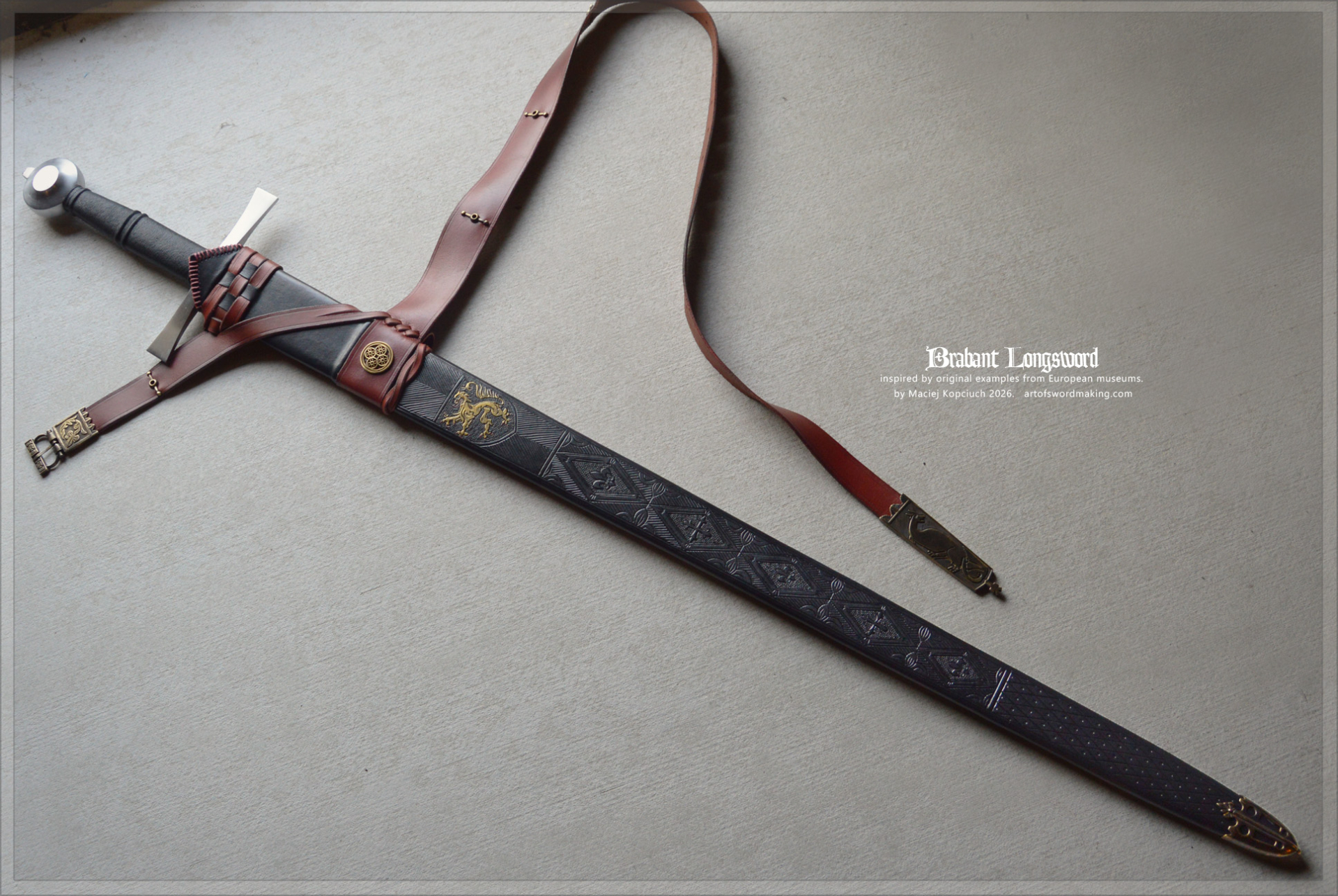 The scabbard features the embossed and painted coat of arms of the Duchy of Brabant: a golden rampant lion with red details.