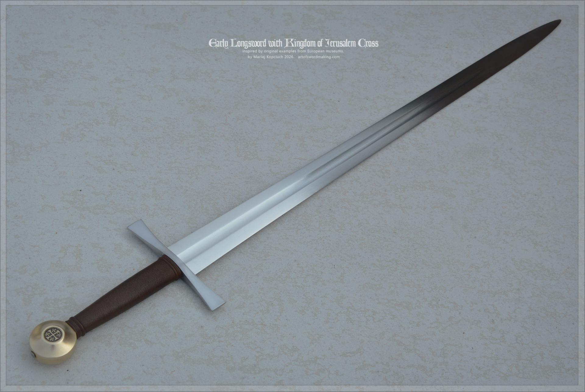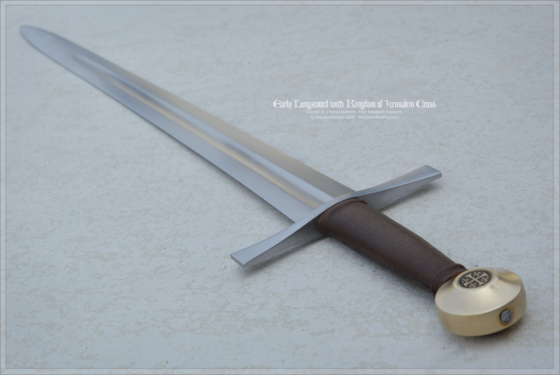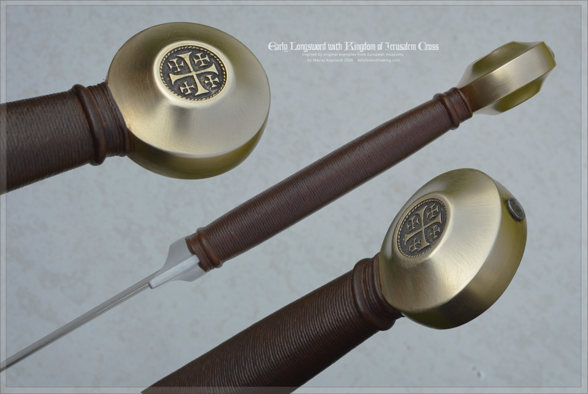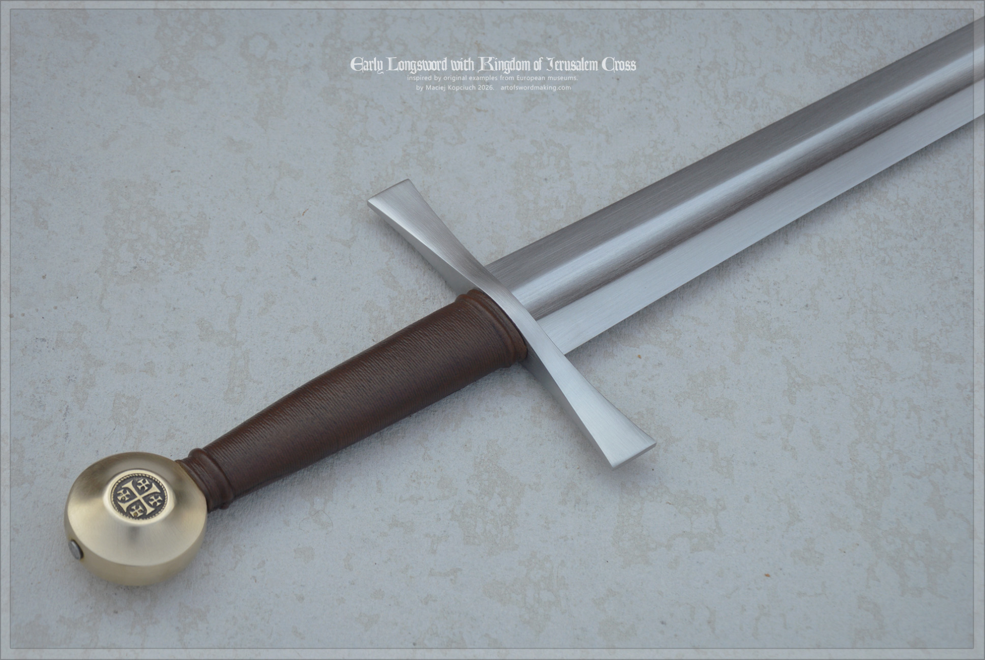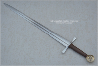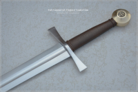Crusader Early Longsword - Kingdom of Jerusalem Sword, late 13th century, inspired by original examples and historical sources. Dark brown grip color, brass pommel with inserts.