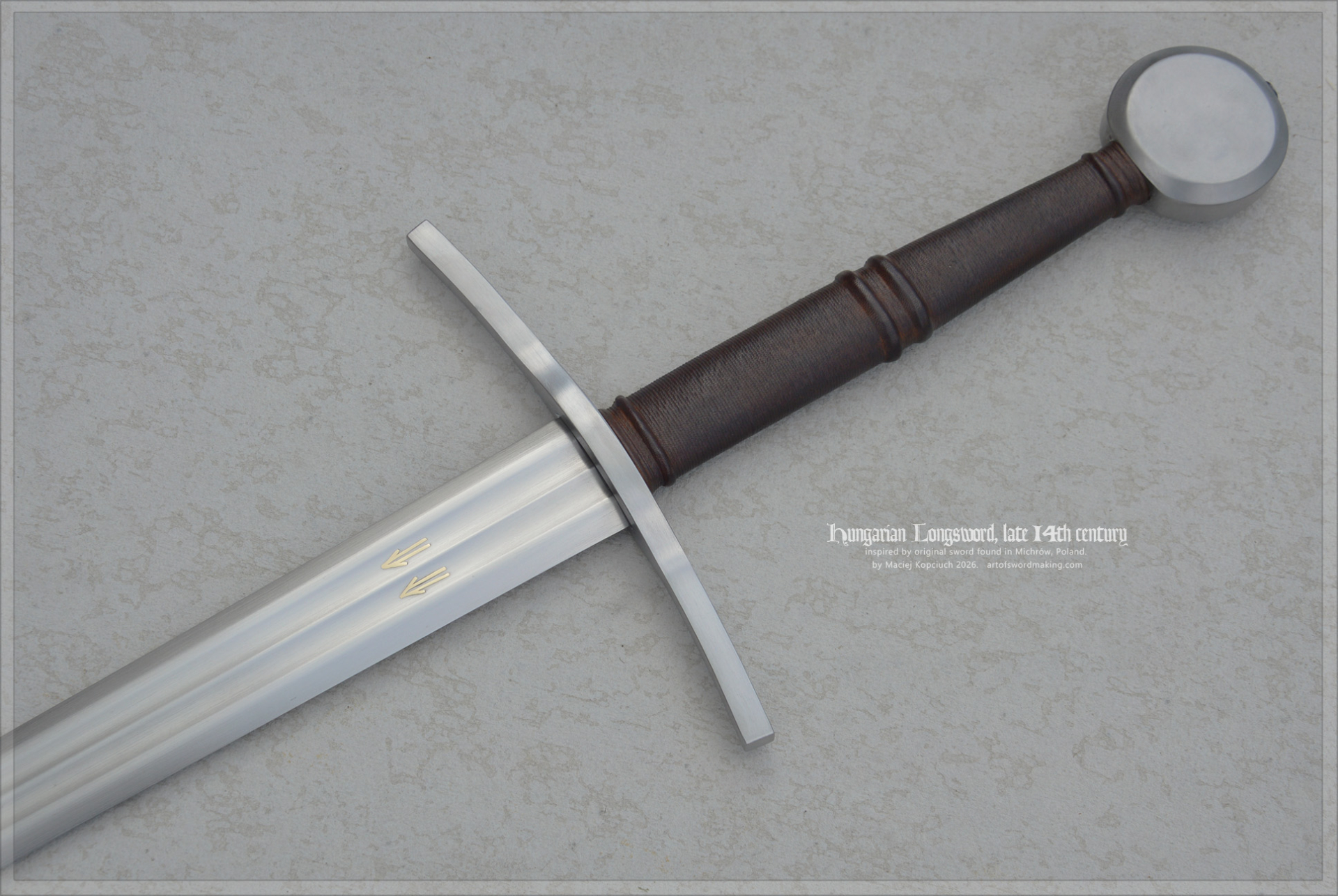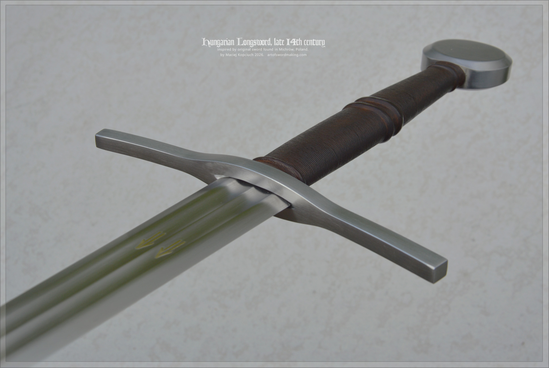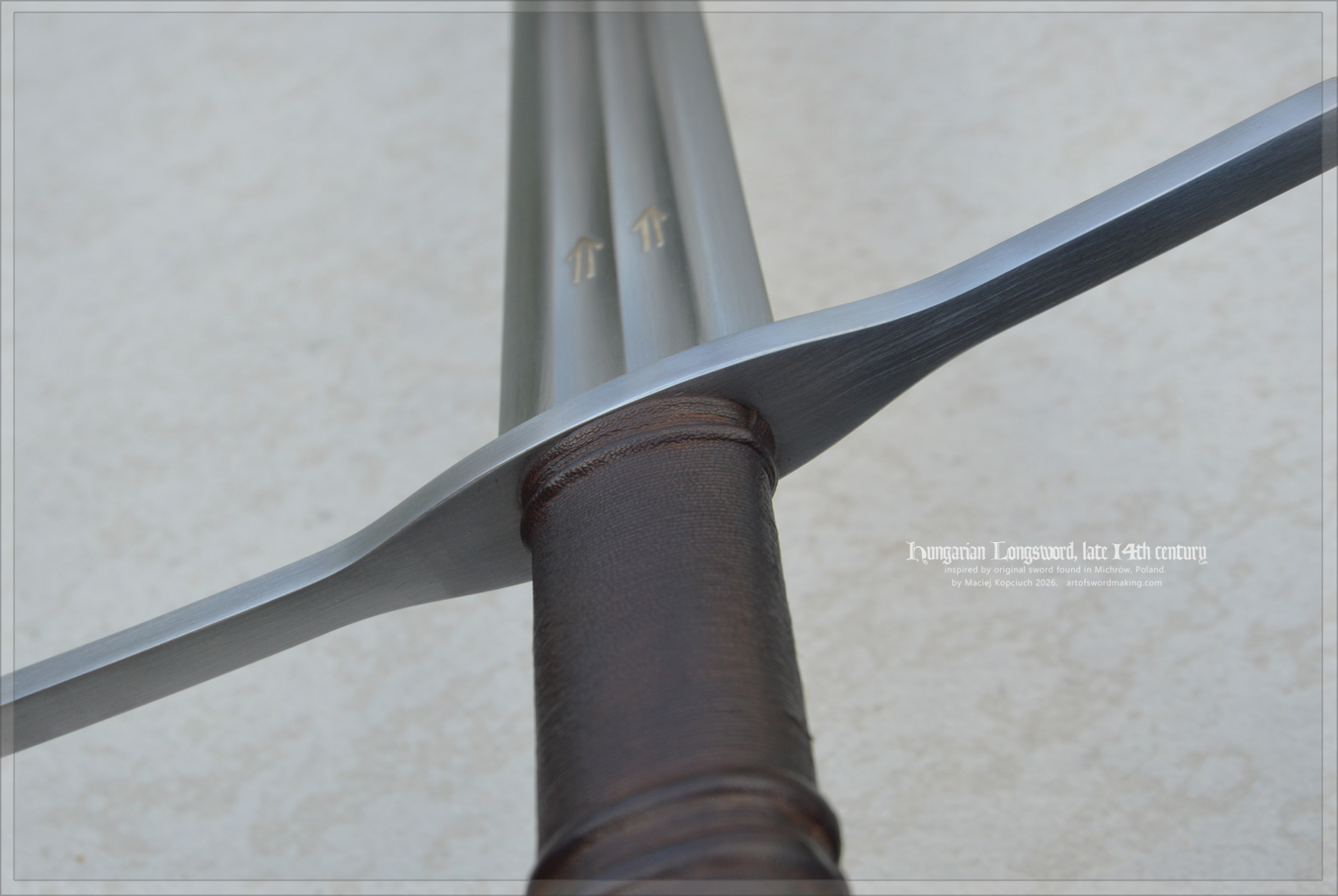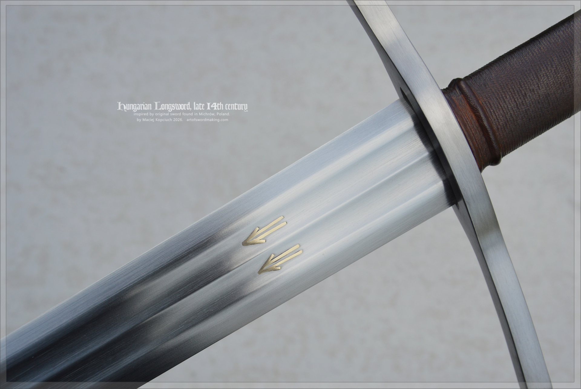 The sword's blade features inlays on both sides, similar to the original sword. They were created using the traditional technique of inlaying with gold metal (a copper alloy, brass). The symbols are double arrows in a symbolic form, found on several other swords and attributed to Hungarian swordsmiths.